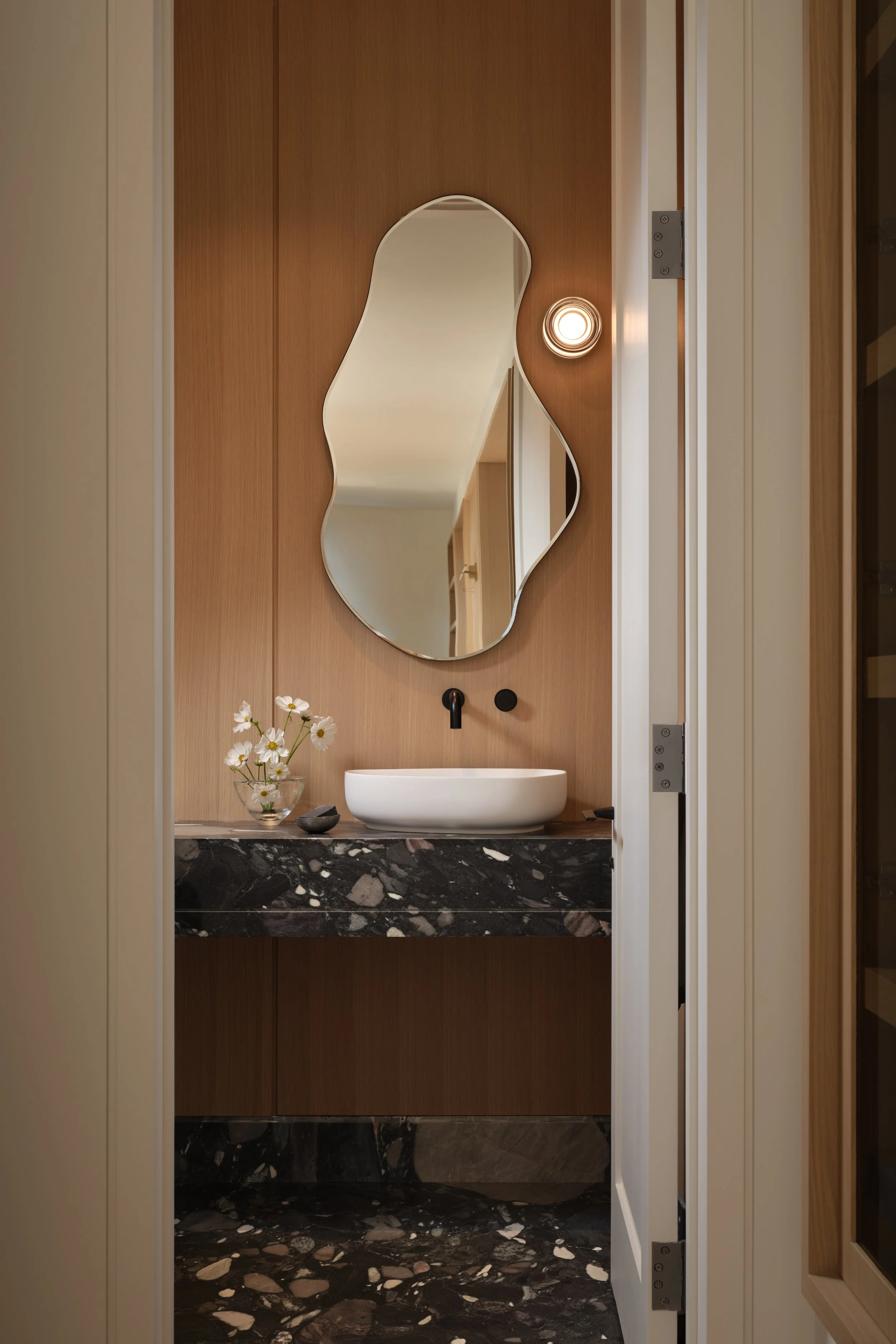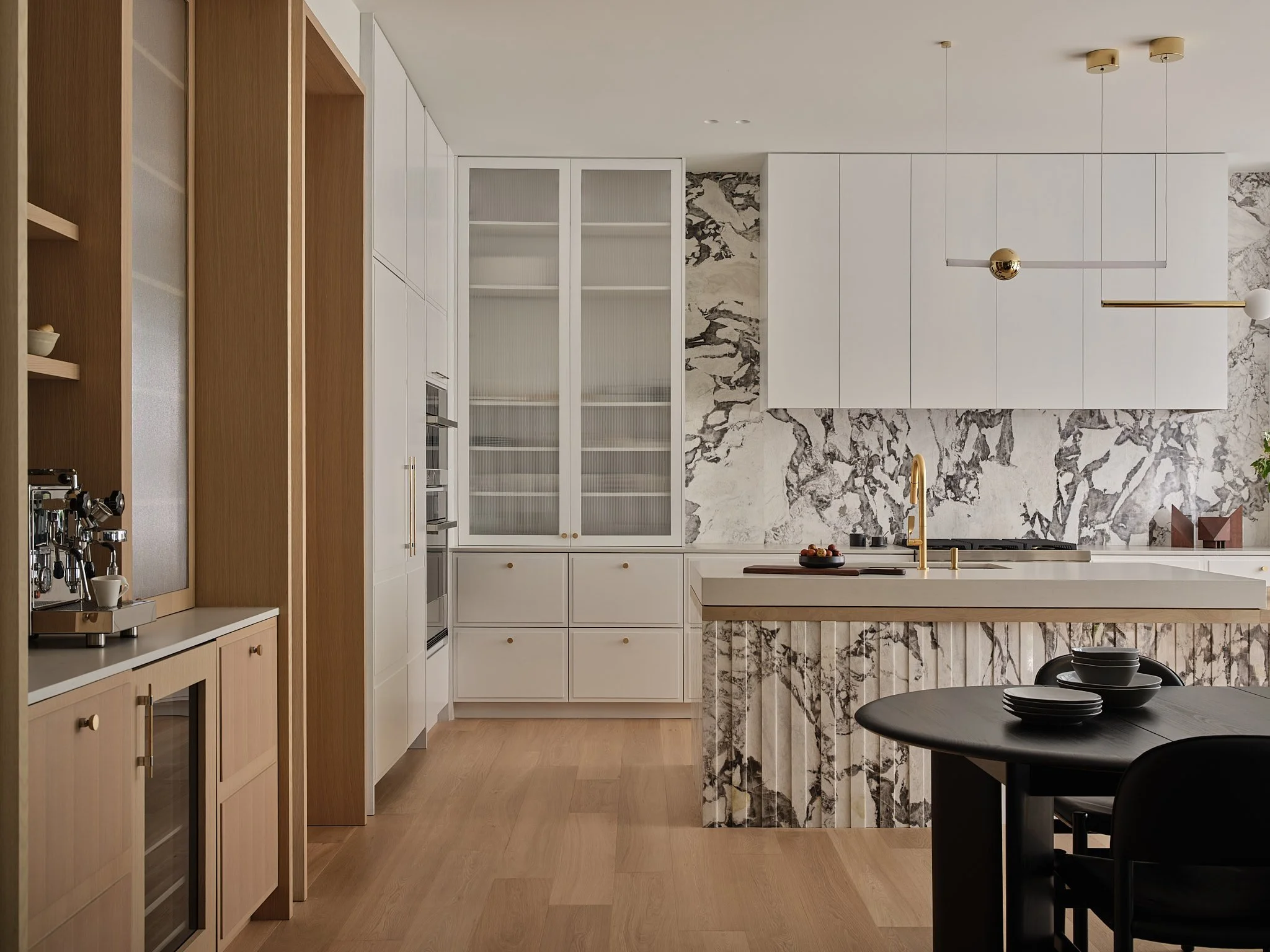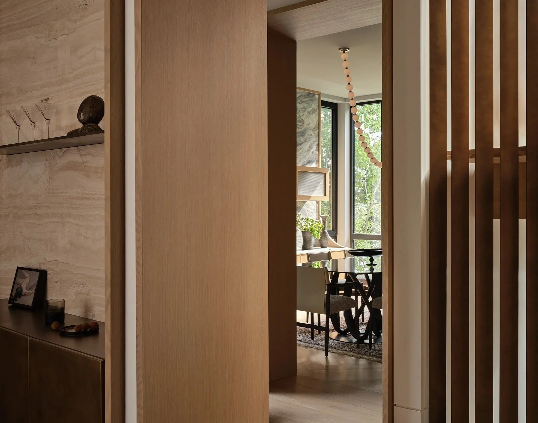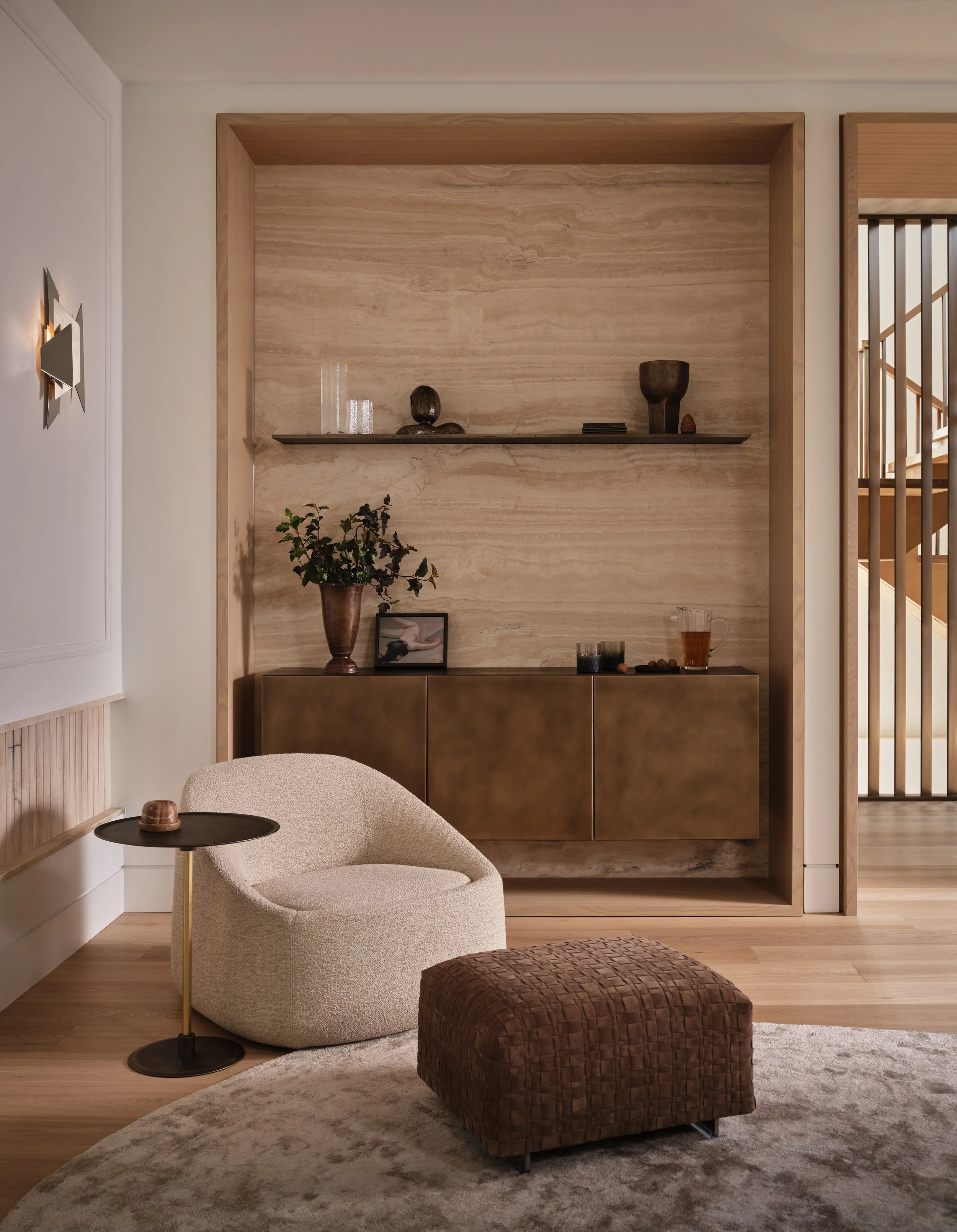 Rooted in a philosophy of thoughtful craftsmanship, the design draws cohesion from a refined palette of natural materials—stone, oak, and metal—applied with precision and care. Every gesture, from the alignment of stone veining to the articulation of custom millwork, is conceived as part of a larger architectural language. A sequence of oak‑framed portals organizes circulation, frames transitions, and conceals storage, while the kitchen—with bespoke cabinetry and a ribbed stone island—becomes both a functional hub and a sculptural anchor.