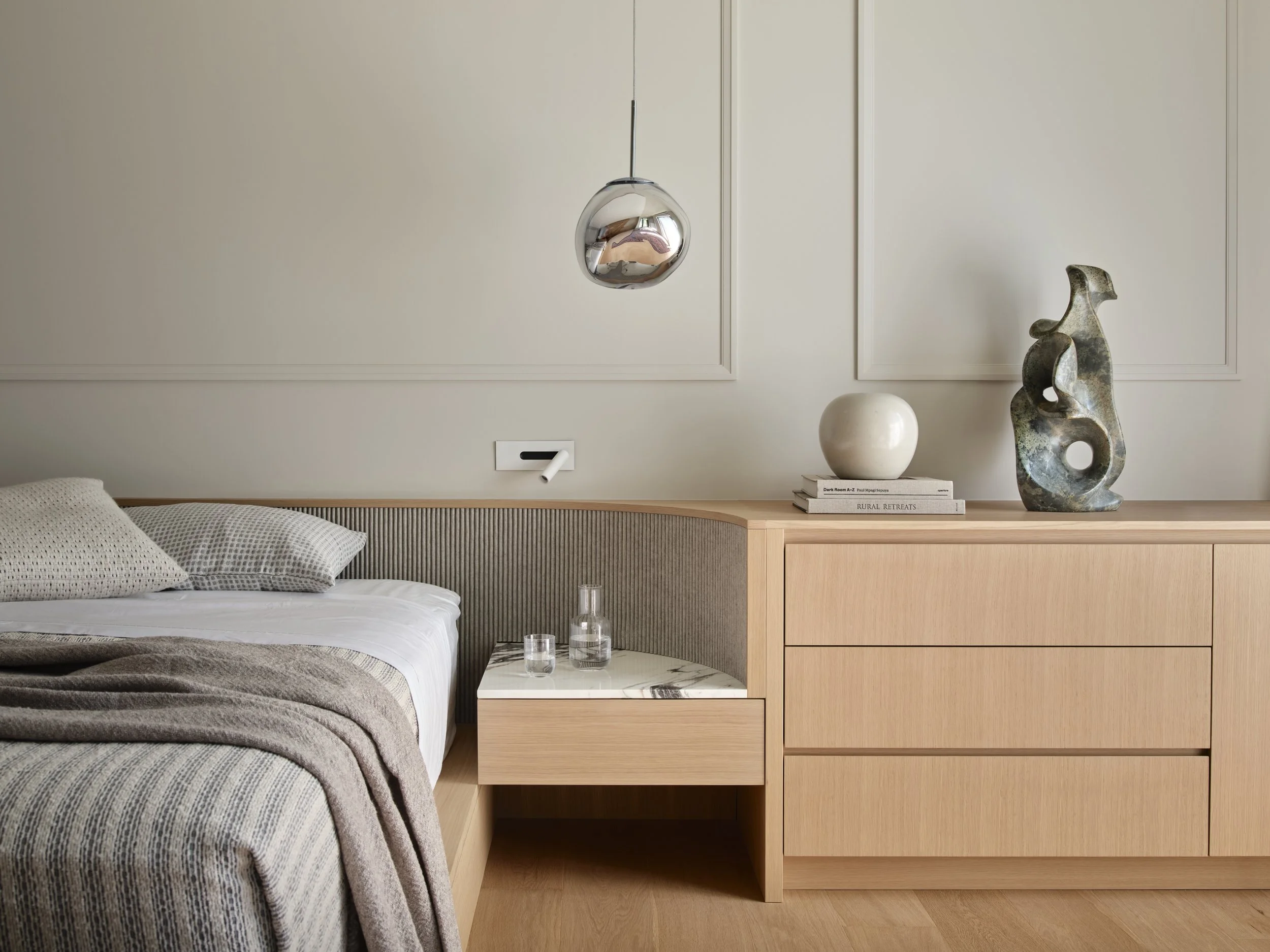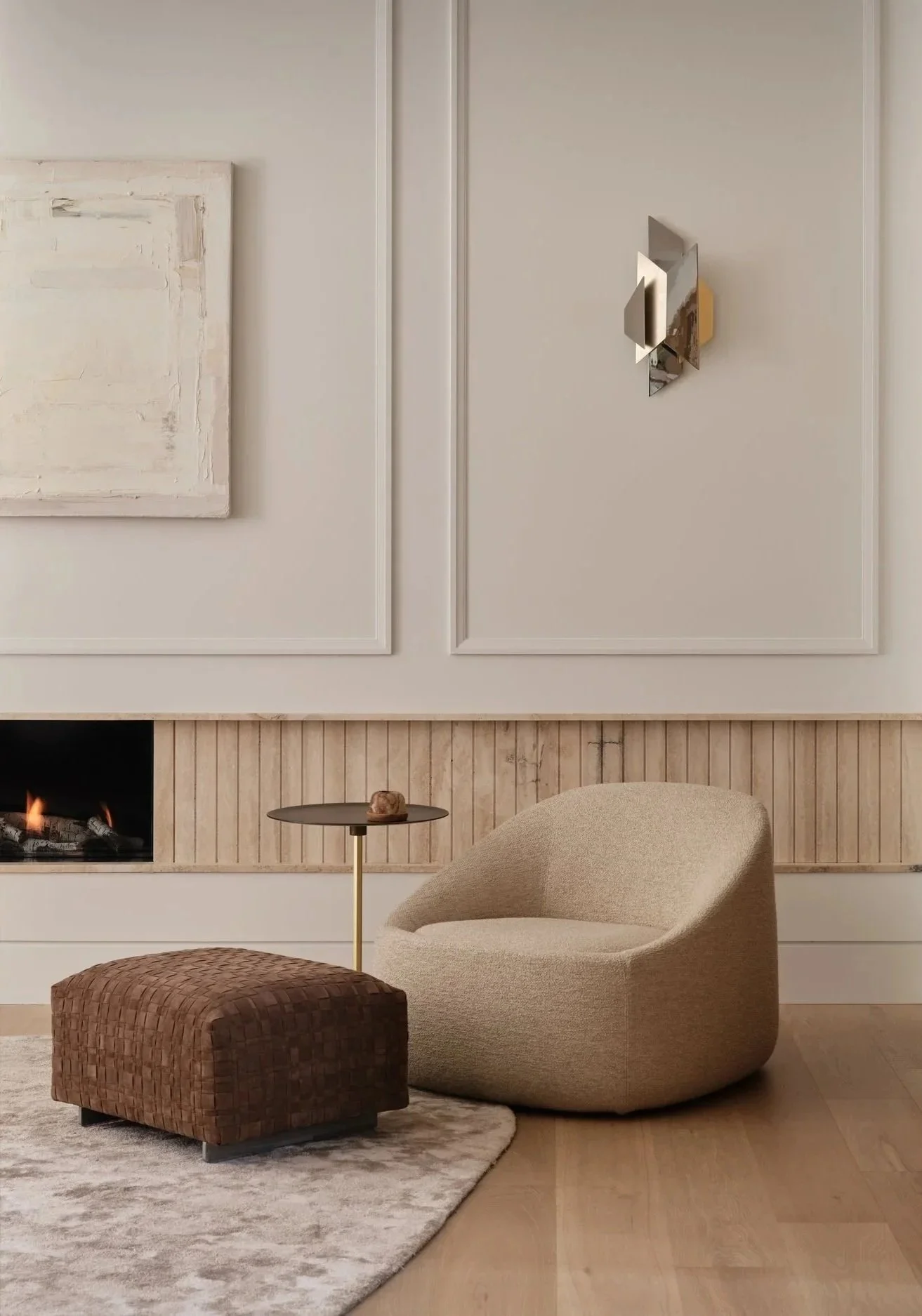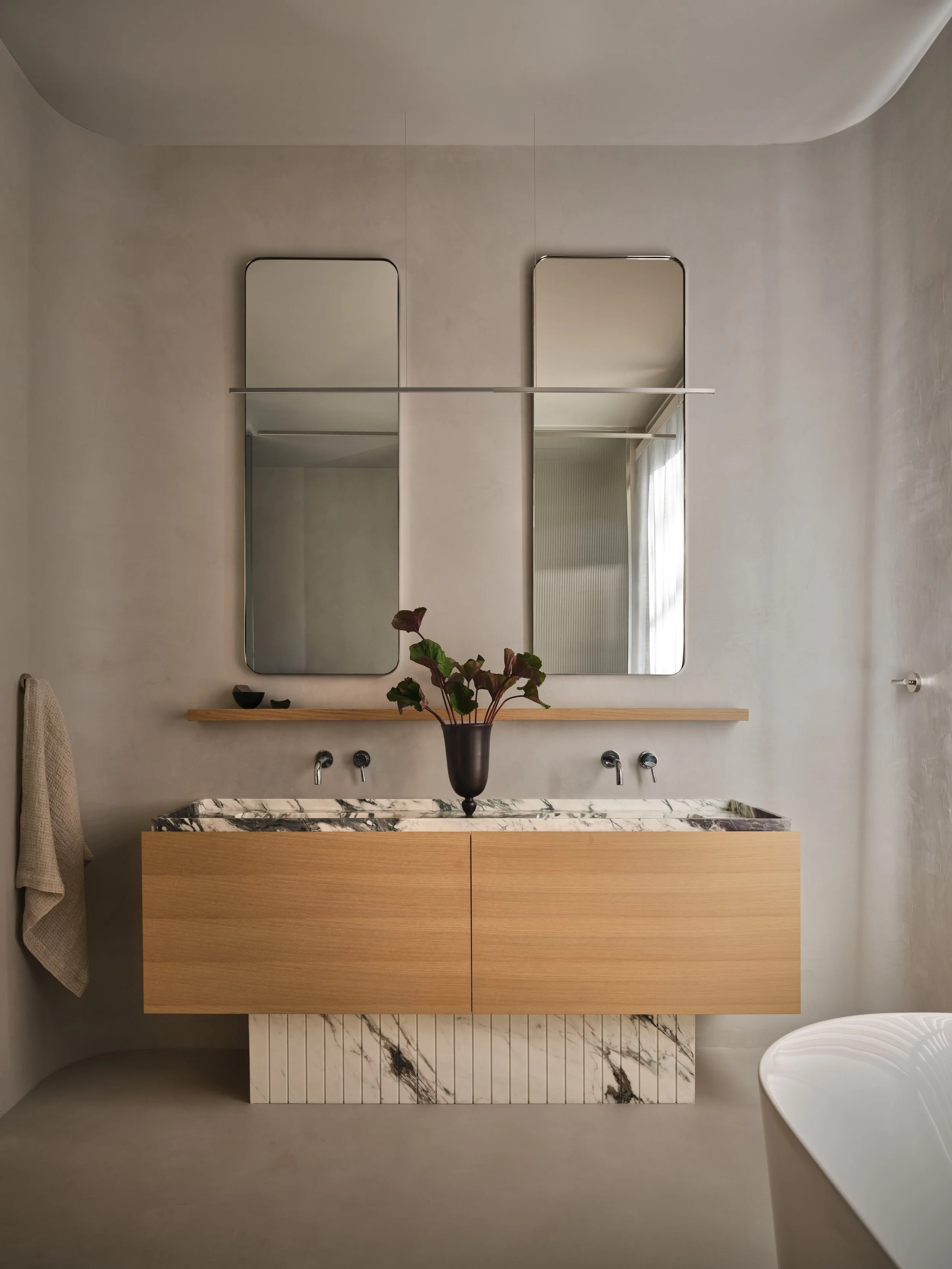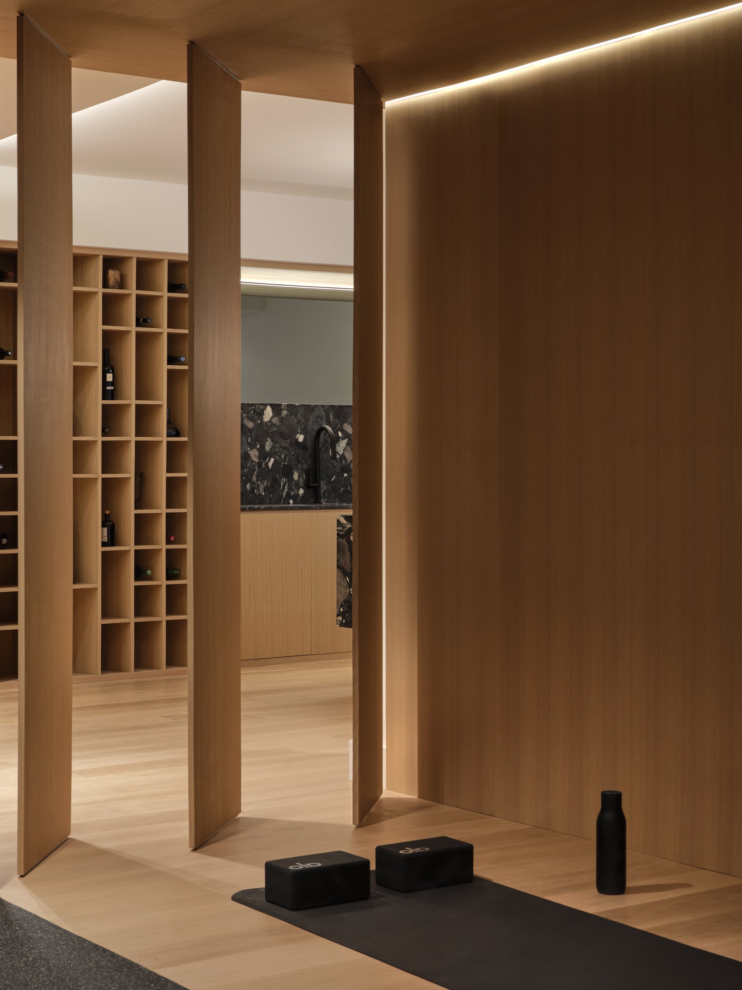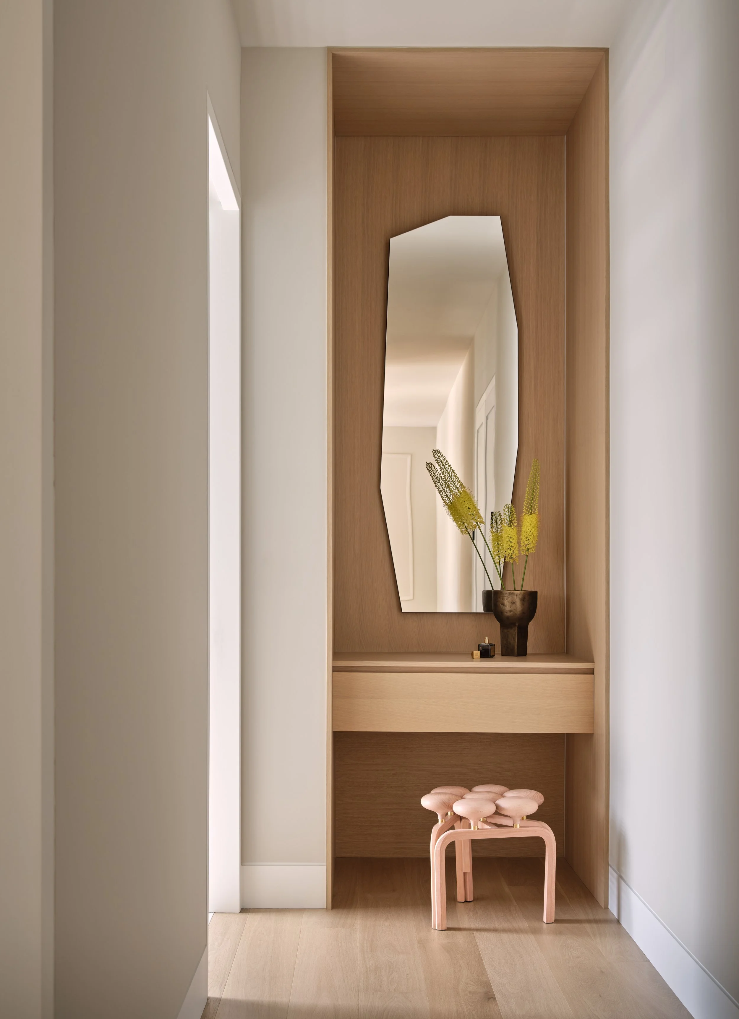 Rooted in a philosophy of thoughtful craftsmanship, the design draws cohesion from a refined palette of natural materials—stone, oak, and metal—applied with precision and care. Every gesture, from the alignment of stone veining to the articulation of custom millwork, is conceived as part of a larger architectural language. A sequence of oak‑framed portals organizes circulation, frames transitions, and conceals storage, while the kitchen—with bespoke cabinetry and a ribbed stone island—becomes both a functional hub and a sculptural anchor.